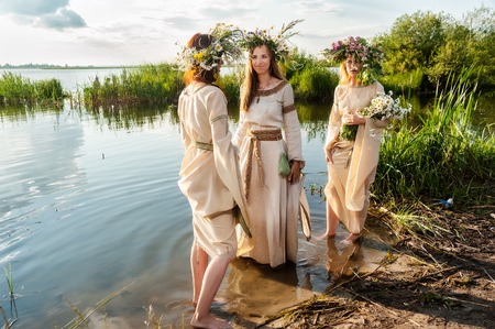 Attractive Women with Wreath of Flowers standing on lake bank Ivan Kupala Holiday Celebration