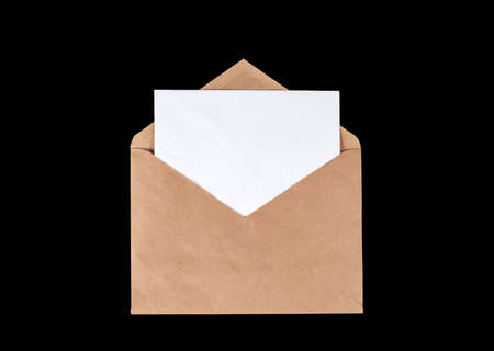 Brown paper craft envelope with a white sheet of paper inside. Copy space