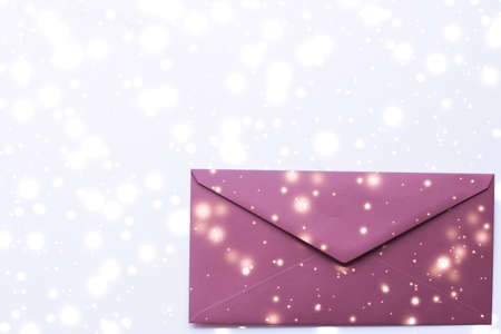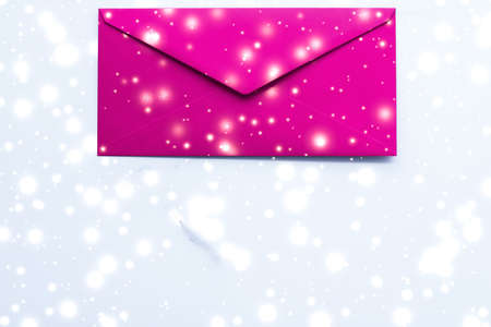 Greetings, postal service and online newsletter concept - Winter holiday blank paper envelopes on marble with shiny snow flatlay background, love letter or Christmas mail card design