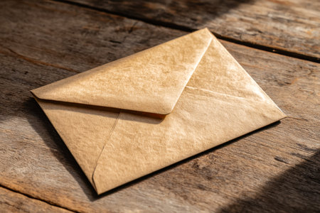 An aged parchment envelope rests atop weathered wooden planks, evoking nostalgia and timeless charm, perfect for vintage-themed correspondence or creative projects.