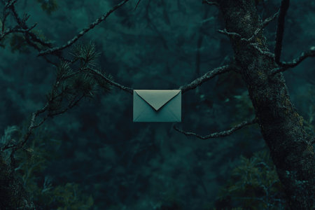 Mysterious envelope suspended on forest branches in moody wilderness scene.