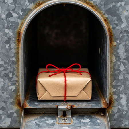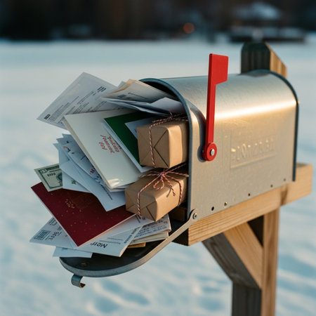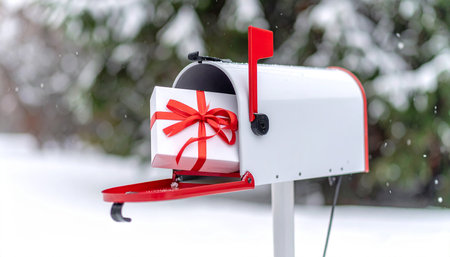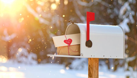 White mailbox with gifts and a heart envelope in winter sunlight. Clear details and vibrant colors enhance vis...