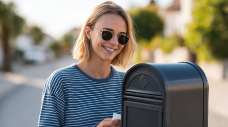 A vibrant blue mailbox is filled with colorful letters on a calm street. The sun shines on the mailbox, highlighting its charm and inviting the viewer to explore its contents.