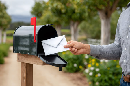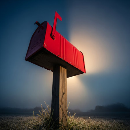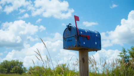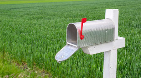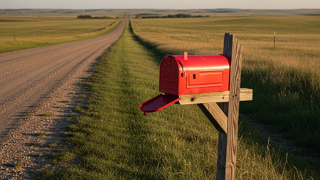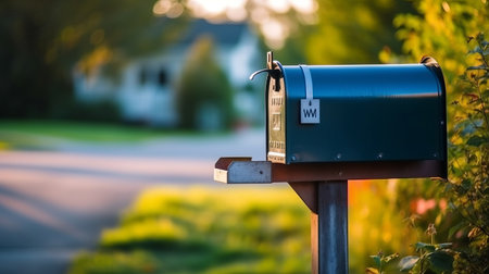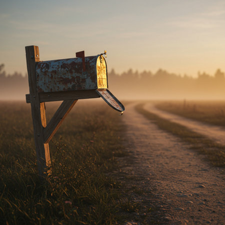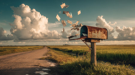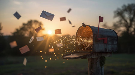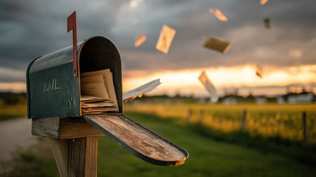 An open mailbox with letters spilling out is the focus. The scene features a green mailbox, a wooden post, and a field bathed in warm sunlight. The composition includes an expansive sky and a blurred background. Suitable for communications, marketing, and editorial purposes.