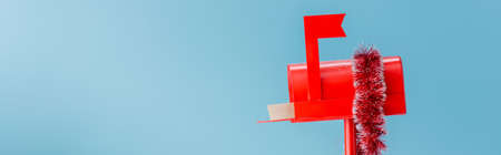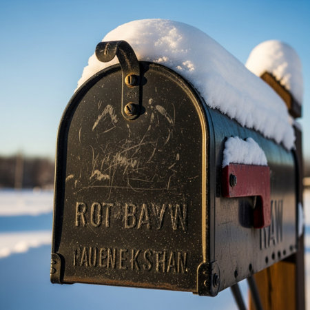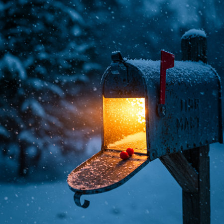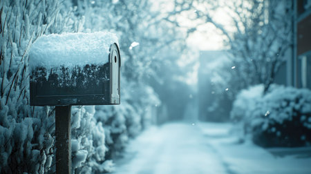 Mailbox in winter sunlight with a white envelope tied with a red ribbon. Clear details and vibrant colors enha...