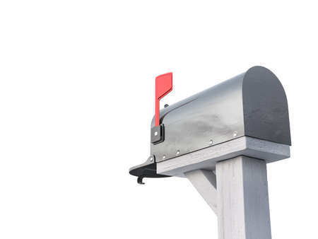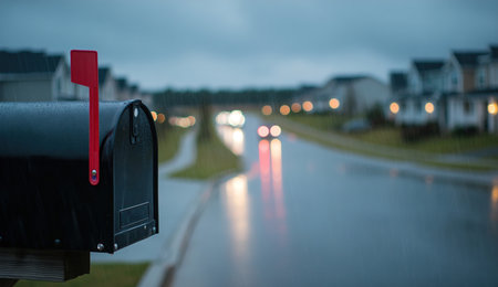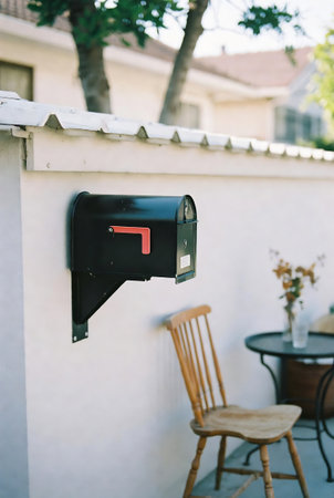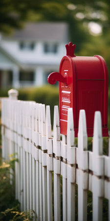 Traditional black mailbox with raised red flag indicating waiting mail, mounted on wooden post of white picket fence in front of residential home