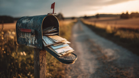 An open mailbox filled with letters sits roadside, the subject of this picturesque image. The composition showcases an open box with documents spilling out, set against a blurred background of a rural road and fields. The image features warm tones, soft lighting, and conveys a feeling of nostalgia. Suitable for editorial and commercial projects.