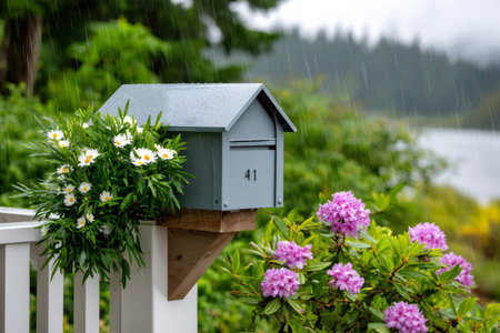 Gray mailbox on a porch railing with daisies and rhododendrons blooming during a spring rain