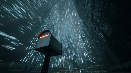 A vibrant red mailbox, glistening with raindrops, stands out against a modern logistics hub It's a beacon of distribution, symbolizing connectivity and movement This close-up shot captures the essence of physical infrastructure in our fast-paced world of commerce and communication, highlighted by the wet, urban scenery AI Generative