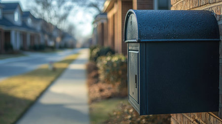 Close-up of a black mailbox with a locking compartment, positioned near the sidewalk of a suburban home.