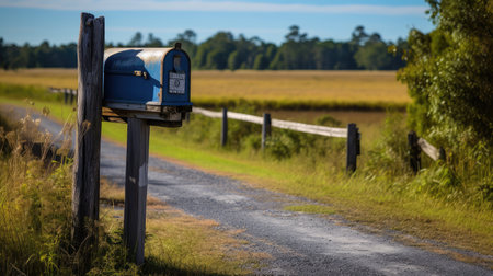 charm blue mailbox illustration character secluded, road wooden, post setting charm blue mailbox