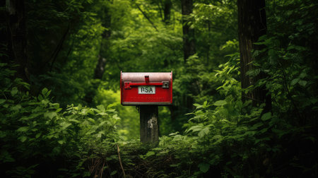 A vintage red mailbox stands on a wooden post, half concealed by thick, vibrant green foliage in a tropical forest. Nature envelops the mailbox, creating a tranquil scene.