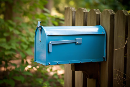 Blue mailbox on a wooden fence in the park at sunset. Close-up.