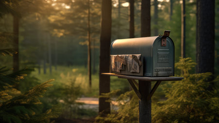 An open mailbox filled with correspondence sits on a wooden post beside a long, empty road. The scene is bathed in warm sunlight, creating a golden glow. The aged metal of the mailbox contrasts with the green foliage and the blurred background. Suitable for various editorial and commercial applications.