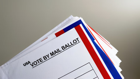 Stack of vote by mail ballots showing red white and blue colors with copy space