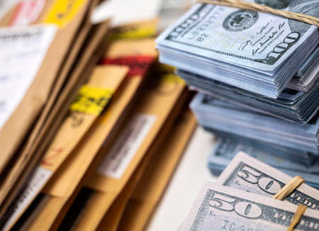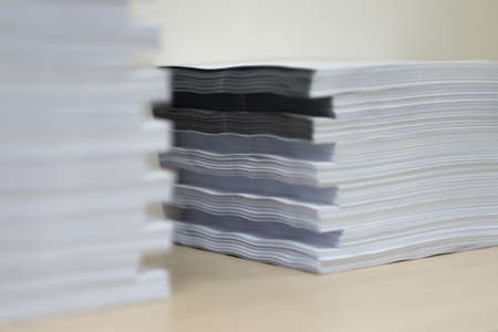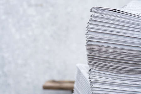 Pile of unfinished documents on office desk folders. Business papers or document is written. Business offices concept.