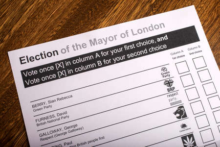 LONDON, UK - APRIL 25TH 2016: A Ballot Paper for Mayor of London Election, taken on 25th April 2016.