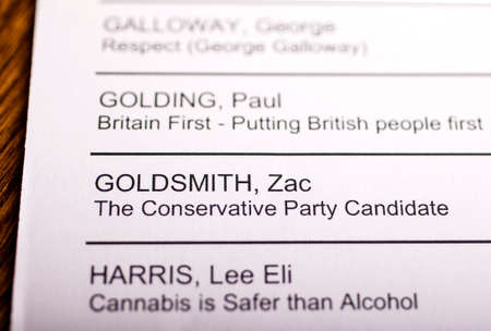 LONDON, UK - APRIL 25TH 2016: The name of Zac Goldsmith on a ballot paper for the Mayor of London Election, taken on 25th April 2016. Zac Goldsmith is the Conservative Party candidate for the 2016 London Mayoral election.