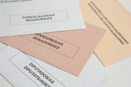 Various types of envelopes to cast the vote in the Spanish and Valencian community elections. Translation of texts: deputies, senators, councilors, elections to the Valencian courts (diputados, senadores, concejales, elecciones a las cortes valencinas)