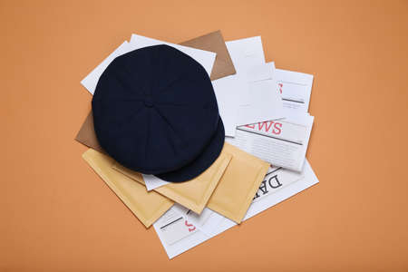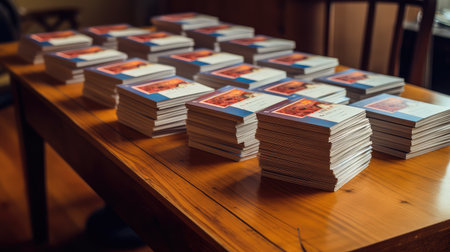 outgoing correspondence: set of blank white envelopes on a wooden desk in the office, toning, blur