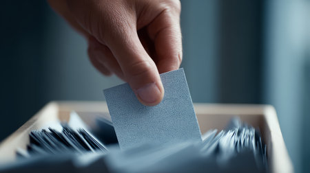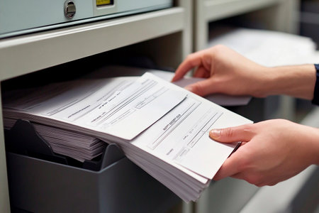 A person is carefully sorting and filing sheets of paper into a cabinet. The workspace is organized and reflects a diligent effort to maintain order among important documents.