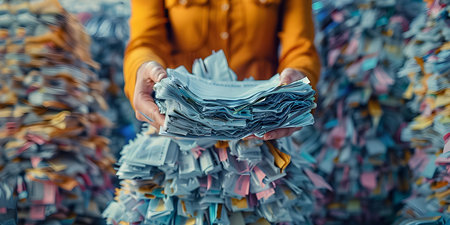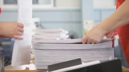 A female hands working in stacks of paper files for searching information on work desk in office.