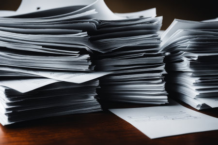 Customs paperwork is being examined closely, highlighting rejected international logos amidst stacks of documents in a warehouse during business hours.
