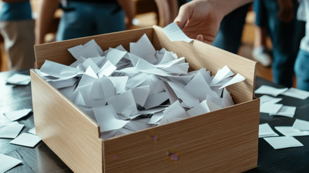 Anonymous man putting the vote in ballot box with a stack of ballots in the foreground, blurry background. Political choice, election day and voting concept. Generative ai.