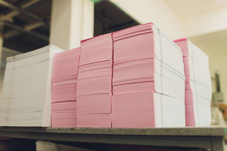 stacks of printed sheets of cardboard on wooden pallets closeup. printing industry.