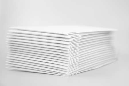 Stack of paper envelopes on white background. A pile of DVDs and CDs in white envelopes. Office supplies