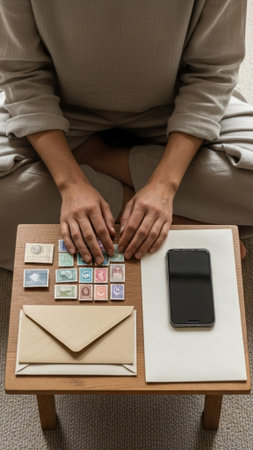 A vertical, full-body composition of a person sitting and focusing on analog communication materials
