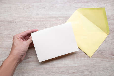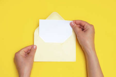 Woman hands holding an open envelope with blank white card on yellow background, mockup