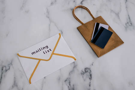 email marketing and converting subscribers into customers, email envelope with Mailing List label and payment cards on top of shopping bag