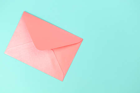 Valentine day greeting concept with envelope on blue background top view. flat lay