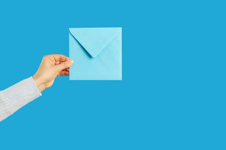 Youve Got Mail. Female hand holding square paper envelope on blue studio background, cropped shot. Courier, carrier, mail woman delivering letter with important message.Mail and communication concept