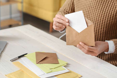 Close-up high-angle view of unrecognizable young woman holding in hands envelope with received letter sitting at table. Lady putting handwritten letter into envelope and closes it, selective focus.