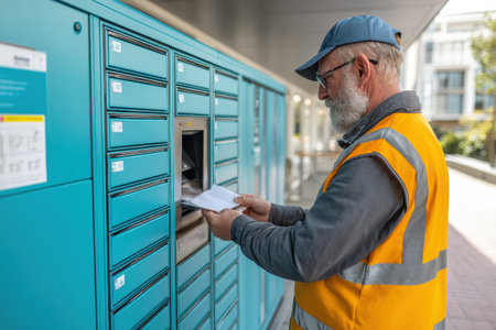 A courier is carefully placing orders into a smart locker station, ensuring efficient package delivery in a busy city setting.