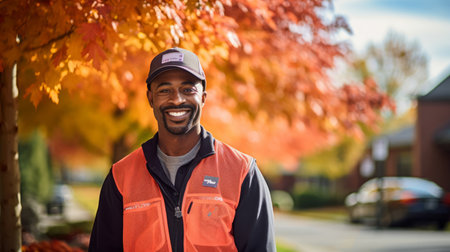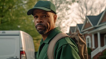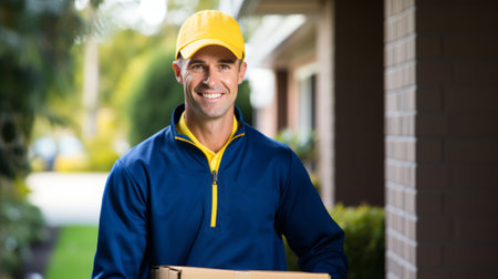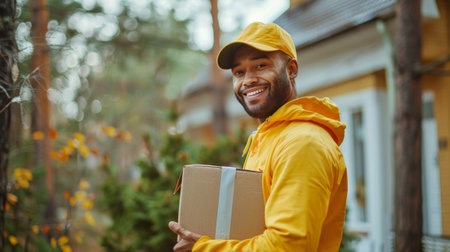 A cheerful delivery man in a yellow uniform with a cap smiles, holding a package, ready to make a doorstep delivery in a residential area.