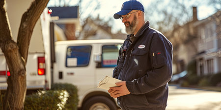 Man dressed in blue jacket and cap delivers packages in a quiet neighborhood with flowers.