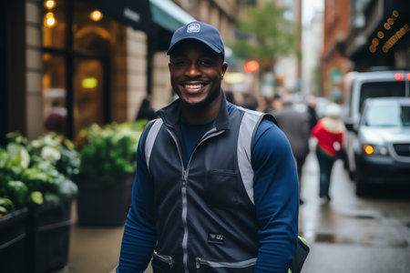 A jovial delivery man energetically carries parcels along a bustling city street, bringing a personal touch to package delivery.