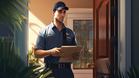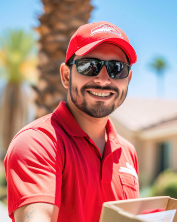 A smiling delivery man in a blue uniform holds a package, ready to deliver it to a house trees and a porch visible in the background.
