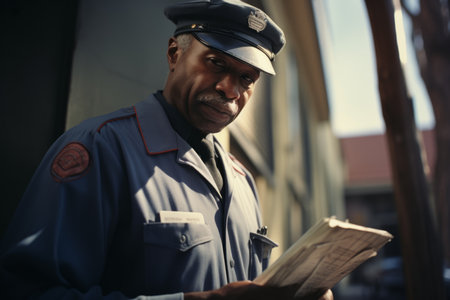 African american postman sorting mail holding letters next to front door suburban area mail delivery courier hat mailman delivering packages correspondence parcels man employee occupation post service