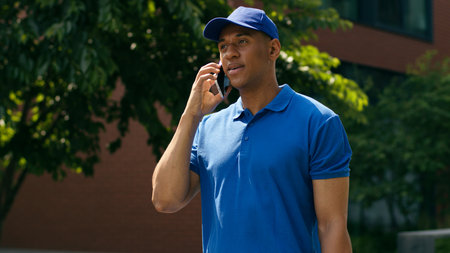 Talking mobile phone calling client ask address communicate with customer purchase receive African American courier guy delivery man postman deliver male in city order food holding paper bag business