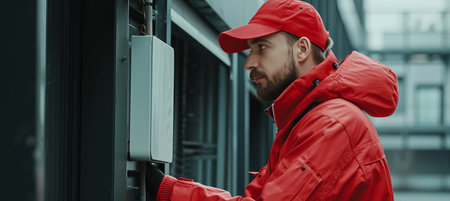Courier in red uniform walking with a box against a red brick wall. Express delivery and urban service.