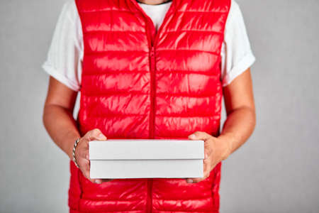 Guy with a cardboard box in his hands. Delivery service concept on red background