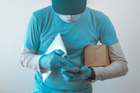 Delivery man with protective clothing using smartphone with protective gloves during viral infection pandemic, selective focus