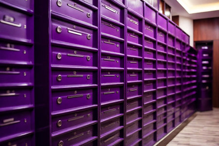 Purple steel Mailboxes in an apartment residential building inside. Modern rows of numbered mailbox, creative design mail backgrounds. Urban correspondence concept. Copy ad text space. Generated AI