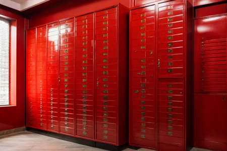 Red steel Mailboxes in an apartment residential building inside. Modern rows of numbered mailbox, creative design mail backgrounds. Urban correspondence concept. Copy ad text space. Generated AI