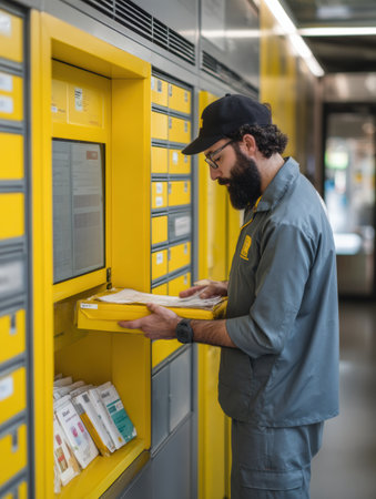 Courier organizes and places packages into a smart locker station, ensuring timely deliveries in an organized and busy setting during daylight hours.