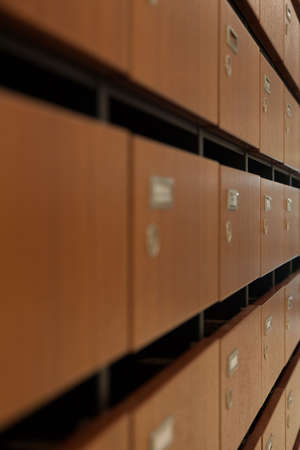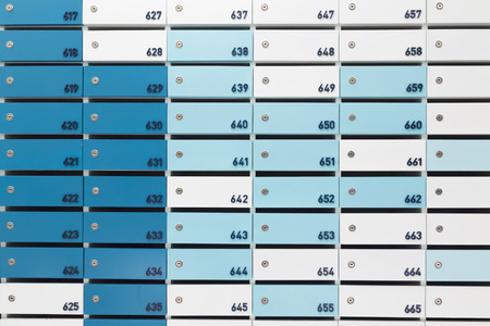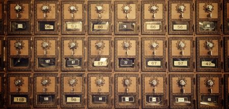 Many mailboxes with keyholes, numbers and correspondence as background